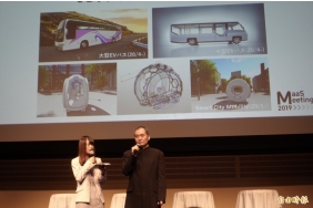 國光客運副董事長吳定發19日在日本高速巴士龍頭WILLER舉辦的「MaaS Meeting 2019」活動中,向日本業者發表由該公司設計的3款大、中、小型電動(EV)巴士。