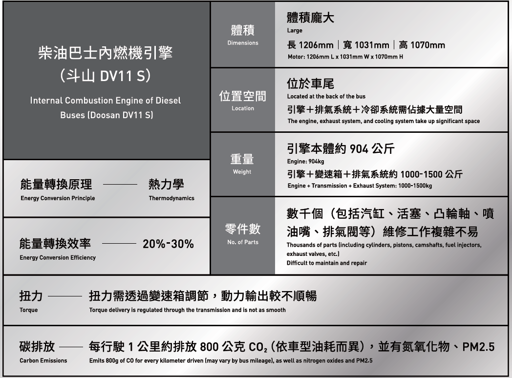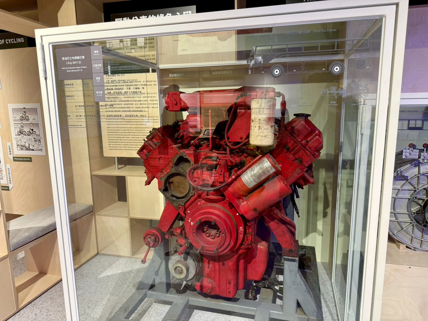 ▲柴油巴士內燃機引擎,體積龐大,包括汽缸、活塞、曲軸、噴油嘴、排氣閥等零件至少數千個,維修工作較複雜不易。