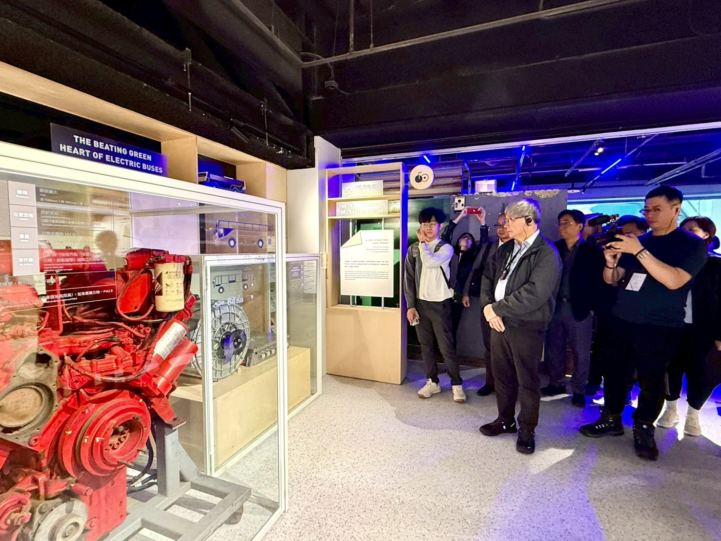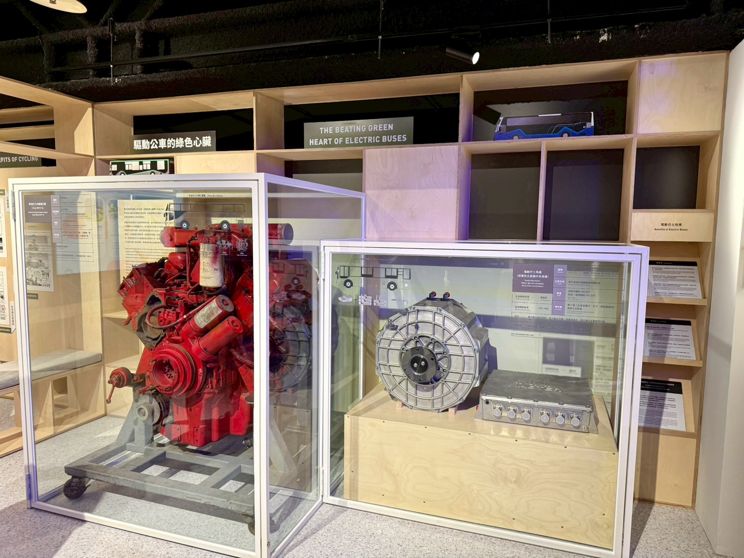 ▲科教館攜手環境部跨域合作推出《回到未來:想像力驅動綠色轉型》常設展,成運汽車於交通轉型區展出電動巴士馬達(右)及柴油巴士引擎(左),呼應政府 2030 年市區公車全面電動化的目標,展現交通綠色轉型帶來的重要效益。