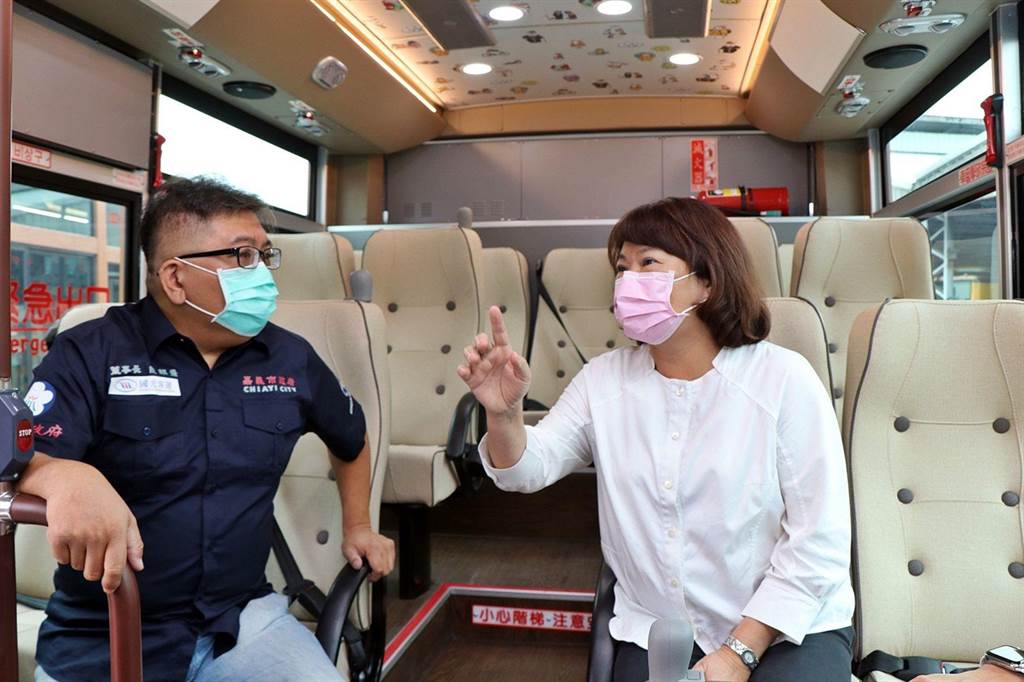 嘉義市長黃敏惠邀請大家來搭乘中大型低底盤電動公車。(嘉義市政府提供)